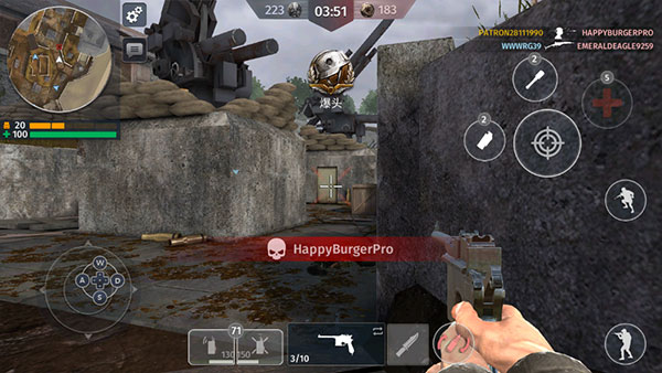3、进入游戏后,操作非常简单,左边控制移动方向,右边控制射击、开镜、换弹等等;