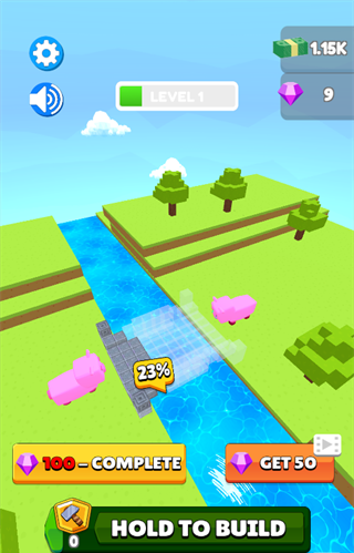 6、最后挖掘的资源不仅仅可以获得金币,还能利用石头搭建小桥,帮助猪猪重逢。