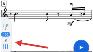 1、进入一起练琴,选择一首需要的练习的乐曲,进入测评模式,在左下角有三个功能选项,选择中间的节拍器