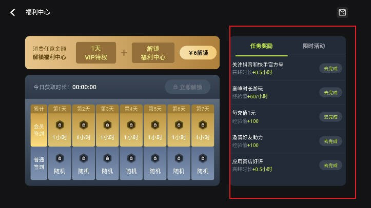 2、通过完成右侧的任务或者签到可以免费获得时长