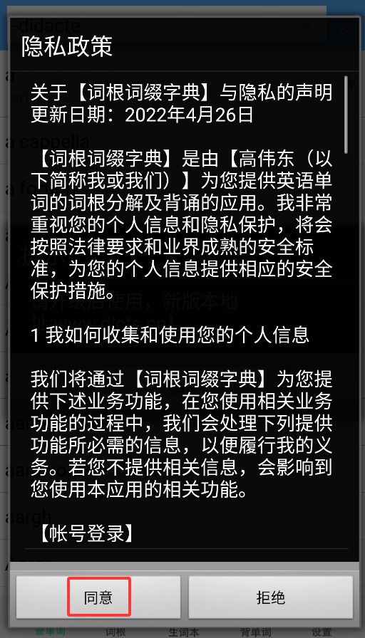1、首次启动词根词缀词典手机版时需点击同意用户协议弹窗,方可进入主界面开始使用。
