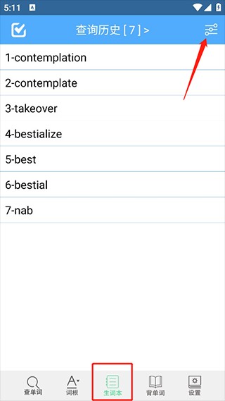2、进入app后我们来到查询单词的界面,这时可以点击底部菜单栏的“生词本”按钮进入界面。