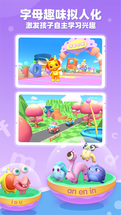 3D动画内容:提供21节3D拼音互动动画内容,让孩子在沉浸式的语境学习环境中快乐学会拼音。