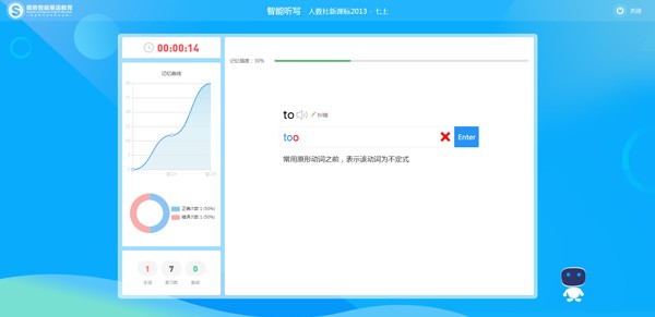 顺势智能英语平台提供智能听写与默写模式,通过不同输入方式巩固词汇记忆。用户可在听音拼写或根据提示默写单词,系统会跟踪拼写错误并安排再次训练,使记忆更扎实。适合考试准备与课堂配套学习。